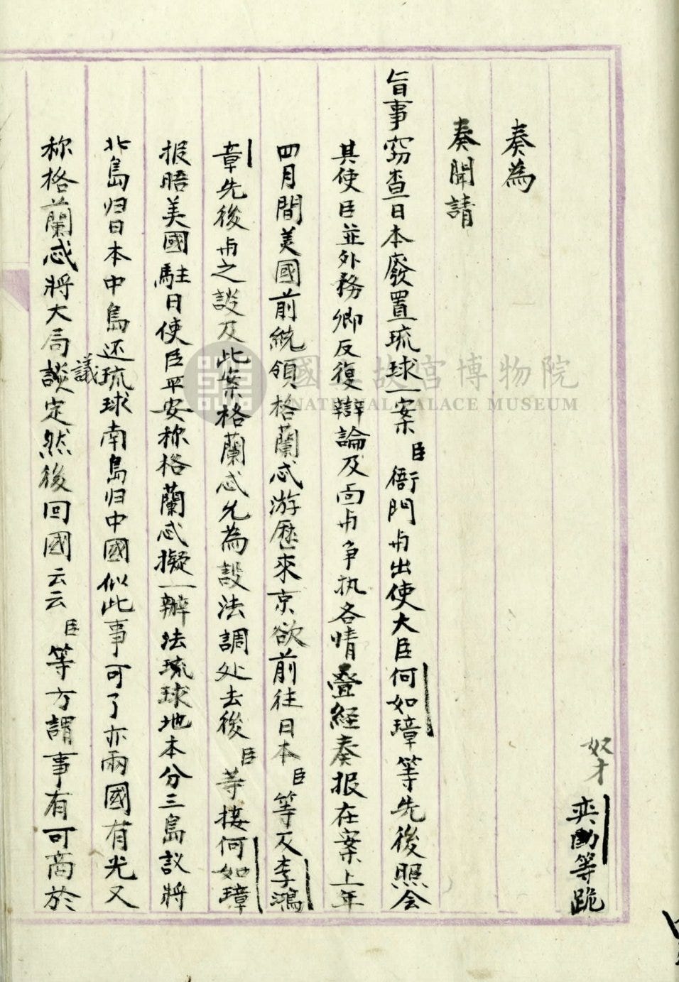 From 1609 until the 1870s, the Ryukyu Kingdom existed simultaneously as a tributary state of both China and Japan. Its official documents continued to be written in Chinese, its court attire followed Chinese styles, and even the 1854 Treaty of Amity between the United States and Ryukyu was signed solely in English and Chinese. However, this subtle balance, which had lasted for more than two centuries, was disrupted by Japan’s rapid rise following the Meiji Restoration. In 1874, Japan transferred administrative authority over Ryukyu from the Ministry of Foreign Affairs to the Ministry of Home Affairs; by 1879, Japan formally annexed the kingdom and reorganized it as Okinawa Prefecture.